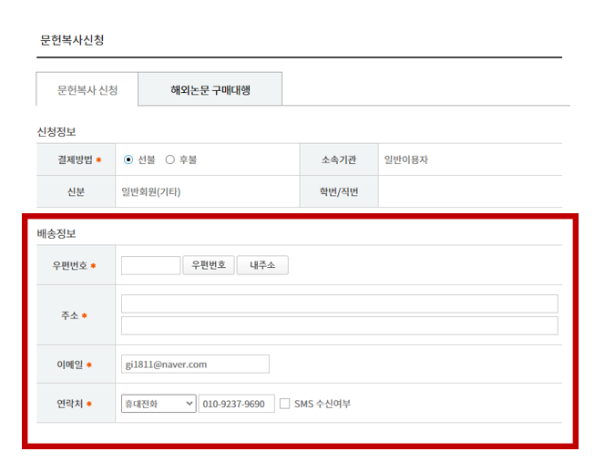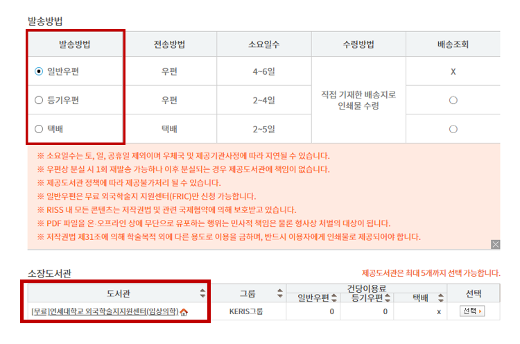 7. 발송방법 선택 (모두 무료) 후 소장기관 "연세대학교 외국학술지지원센터(임상의학)" 선택
