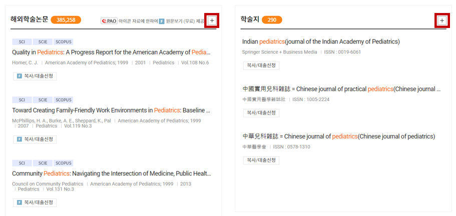 메인화면에 찾고 있는 논문 혹은 학술지가 없다면 우측 상단 + 아이콘을 눌러 '더보기' 가능