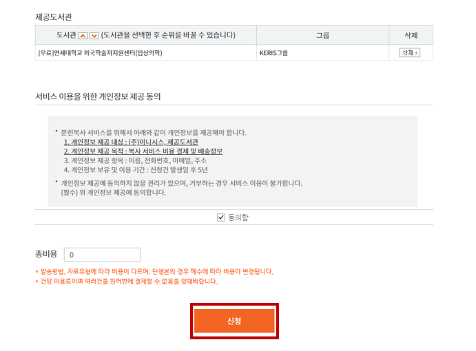 7. 발송방법 선택 (모두 무료) 후 소장기관 "연세대학교 외국학술지지원센터(임상의학)" 선택