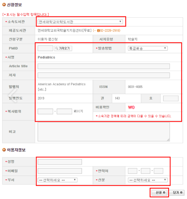 6. 소속기관 선택 후 서지정보 입력, 이용자 정보 기입 후 신청 클릭