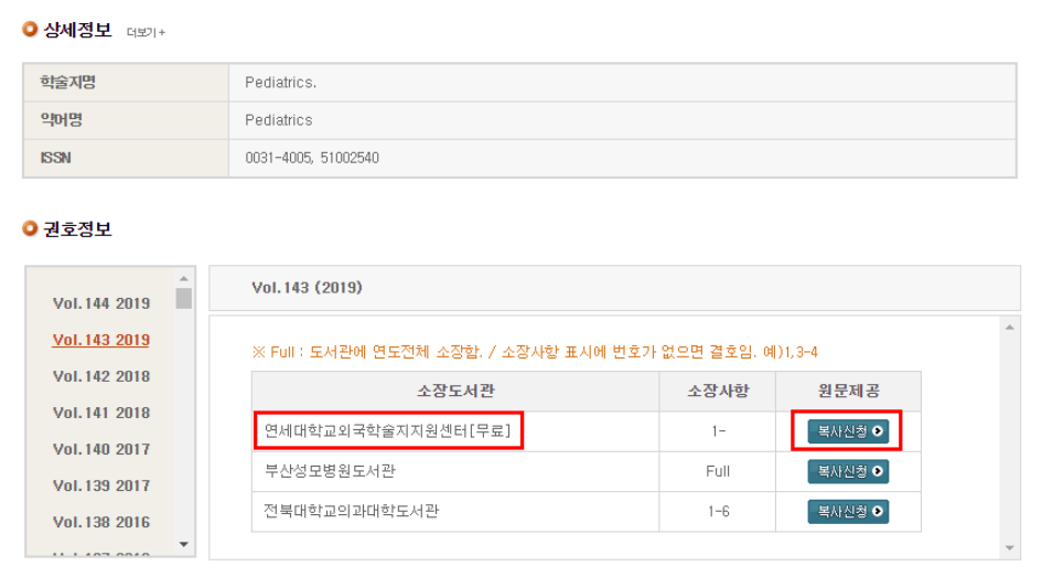 4. 권호정보-소장처에 '연세대학교 외국학술지지원센터'가 있는지 확인 후 복사신청