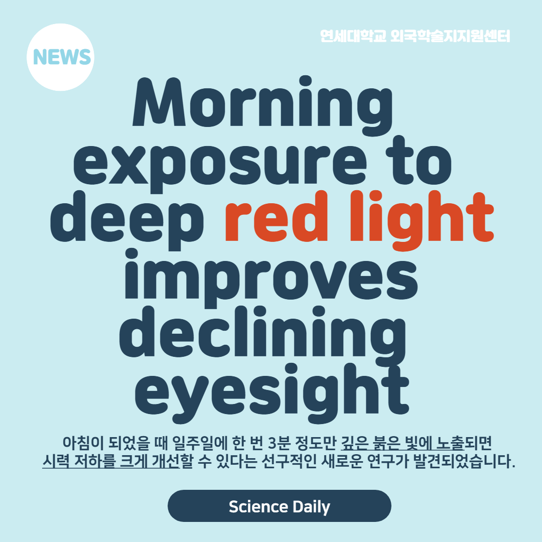 임상의학 최신뉴스 [Ophthalmology] Morning exposure to deep red light improves declining eyesight by 외국학술지지원센터 2021. 11. 25. 상기 이미지를 클릭하시면 해당 기사 원문으로 이동합니다. 공유하기 게시글 관리 연세대학교 외국학술지지원센터(FRIC) 저작자표시 (새창열림) '임상의학 최신뉴스' 카테고리의 다른 글 [Heart] Heart repair and regeneration after a heart attack (0) 2021.12.02 [Dermatology] Suffering from psoriasis? Blame this trio of proteins (0) 2021.11.29 [Cancer] How surviving cancer as a child affects lifelong health (0) 2021.11.24 [Immunology] Scientists discover sugar molecule on HIV-infected cell plays role in evading immune system (0) 2021.11.15 [Dentisty] Baby teeth may one day help identify kids at risk for mental disorders later in life (0) 2021.11.11 관련글 [Heart] Heart repair and regeneration after a heart attack [Dermatology] Suffering from psoriasis? Blame this trio of proteins [Cancer] How surviving cancer as a child affects lifelong health [Immunology] Scientists discover sugar molecule on HIV-infected cell plays role in evading immune system 댓글