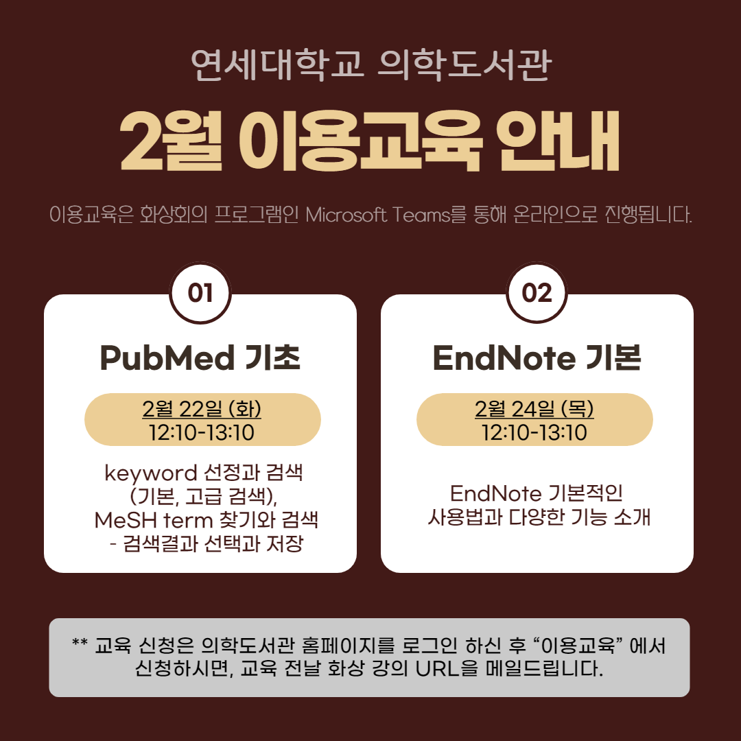 | 2/22 (화) | 12:10-13:10 | PubMed 기초 | MS Teams(온라인) |