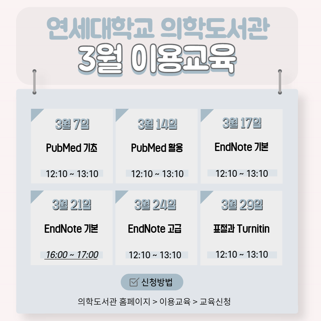 2022년도 의학도서관의 3월 이용교육 일정 알려드립니다.