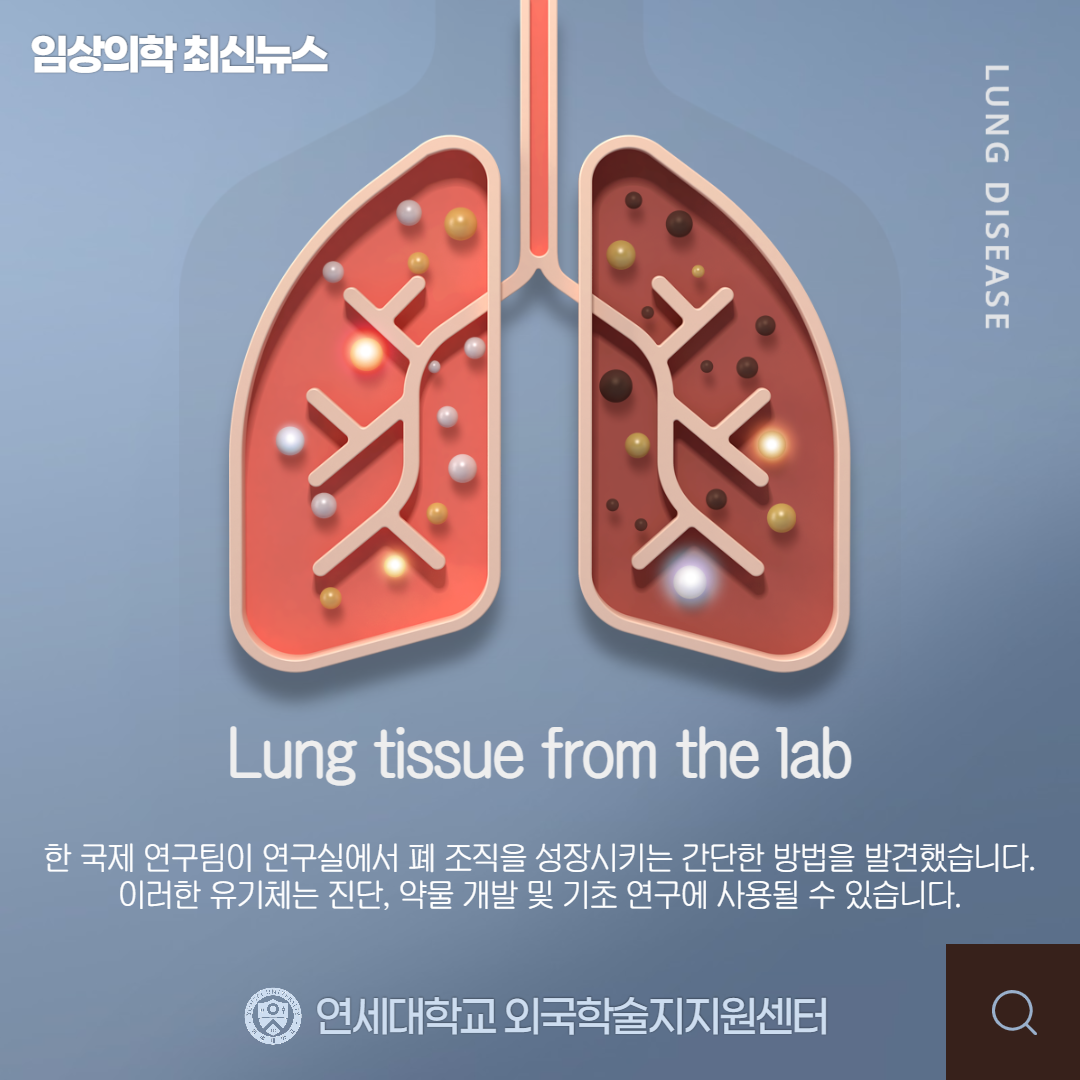 임상의학 최신뉴스 [Lung Disease] Lung tissue from the lab by 외국학술지지원센터 2022. 3. 21. 상기 이미지를 클릭하시면 해당 기사 원문으로 이동합니다. 공유하기 게시글 관리 연세대학교 외국학술지지원센터(FRIC) 저작자표시 (새창열림) '임상의학 최신뉴스' 카테고리의 다른 글 [Cardiology] Large study challenges the theory that light alcohol consumption benefits heart health (0) 2022.03.29 [Nephrology] Improving prognosis in chronic kidney disease (0) 2022.03.24 [Pediatrics] Childhood trauma and genetics linked to increased obesity risk (0) 2022.03.10 [Dentisty] Evidence grows for vaping's role in gum disease (0) 2022.02.28 [Cardiology] New medicines for treating heart patients (0) 2022.02.23 관련글 [Cardiology] Large study challenges the theory that light alcohol consumption benefits heart health [Nephrology] Improving prognosis in chronic kidney disease [Pediatrics] Childhood trauma and genetics linked to increased obesity risk [Dentisty] Evidence grows for vaping's role in gum disease 댓글