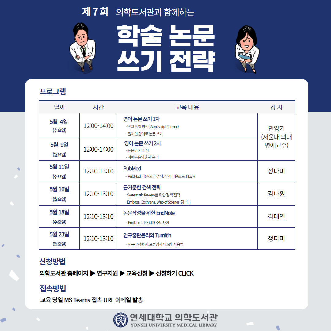 5월 이용교육은 [제7회 의학도서관과 함께하는 학술논문 쓰기 전략]을 주제로 운영되며,