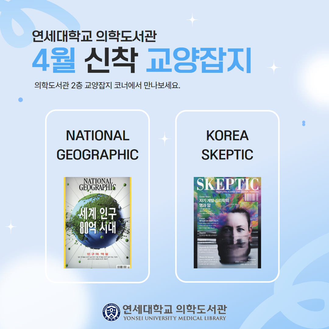 연세대학교 의학도서관 2층 잡지 코너에 비치 되어 있으니 자유롭게 읽어보세요😎😎