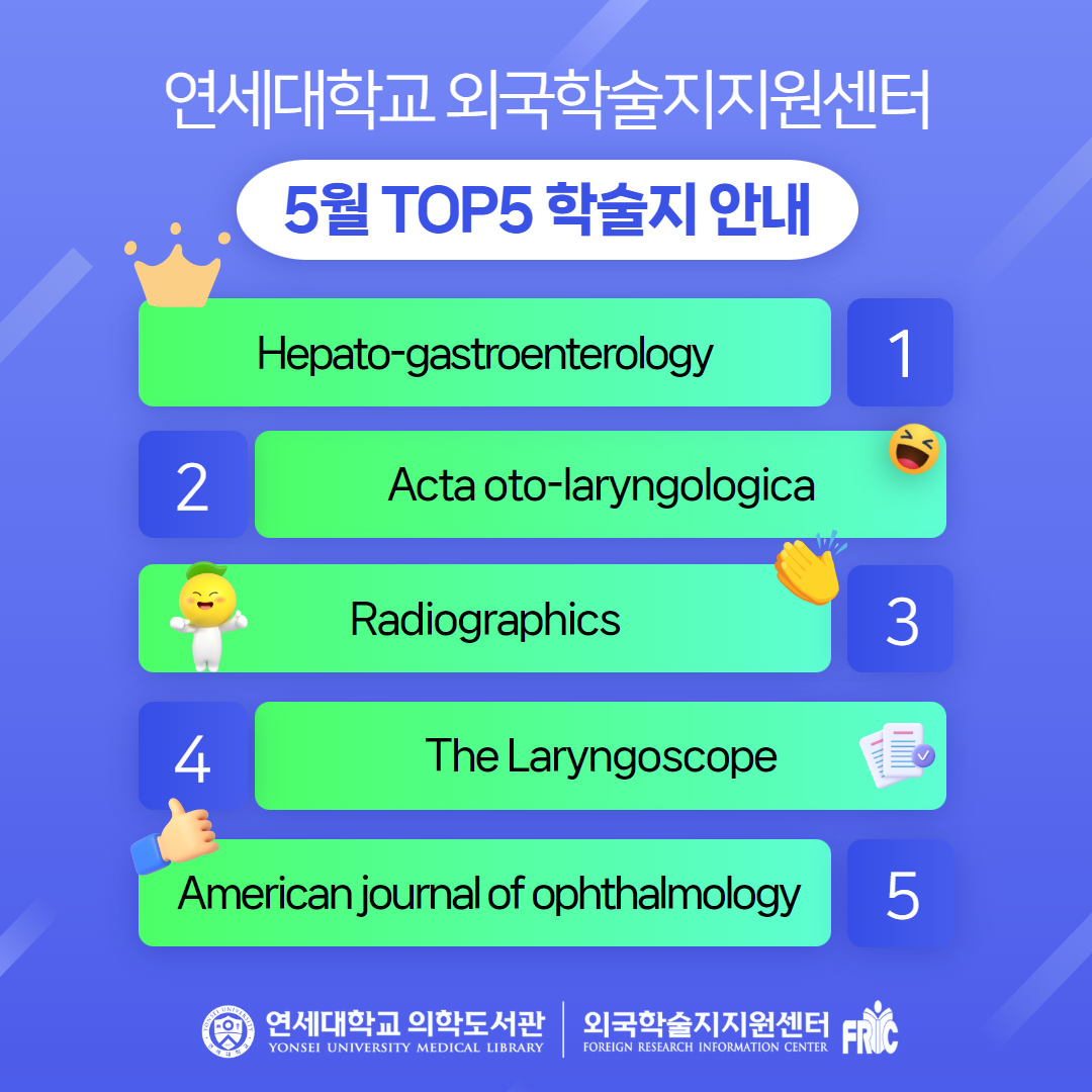 2023년 5월 한 달 동안 연세대 외국학술지 지원센터로 가장 신청이 많이 들어왔던 저널 5종입니다.