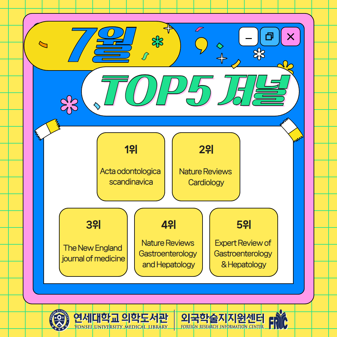 2023년 7월 한 달 동안 연세대학교 외국학술지 지원센터로 가장 신청이 많이 들어왔던 저널 5종입니다.