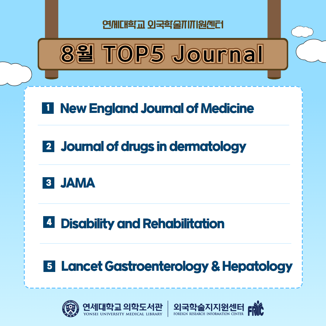 2023년 8월 한 달 동안 연세대학교 외국학술지 지원센터로 가장 신청이 많이 들어왔던 저널 5종입니다.
