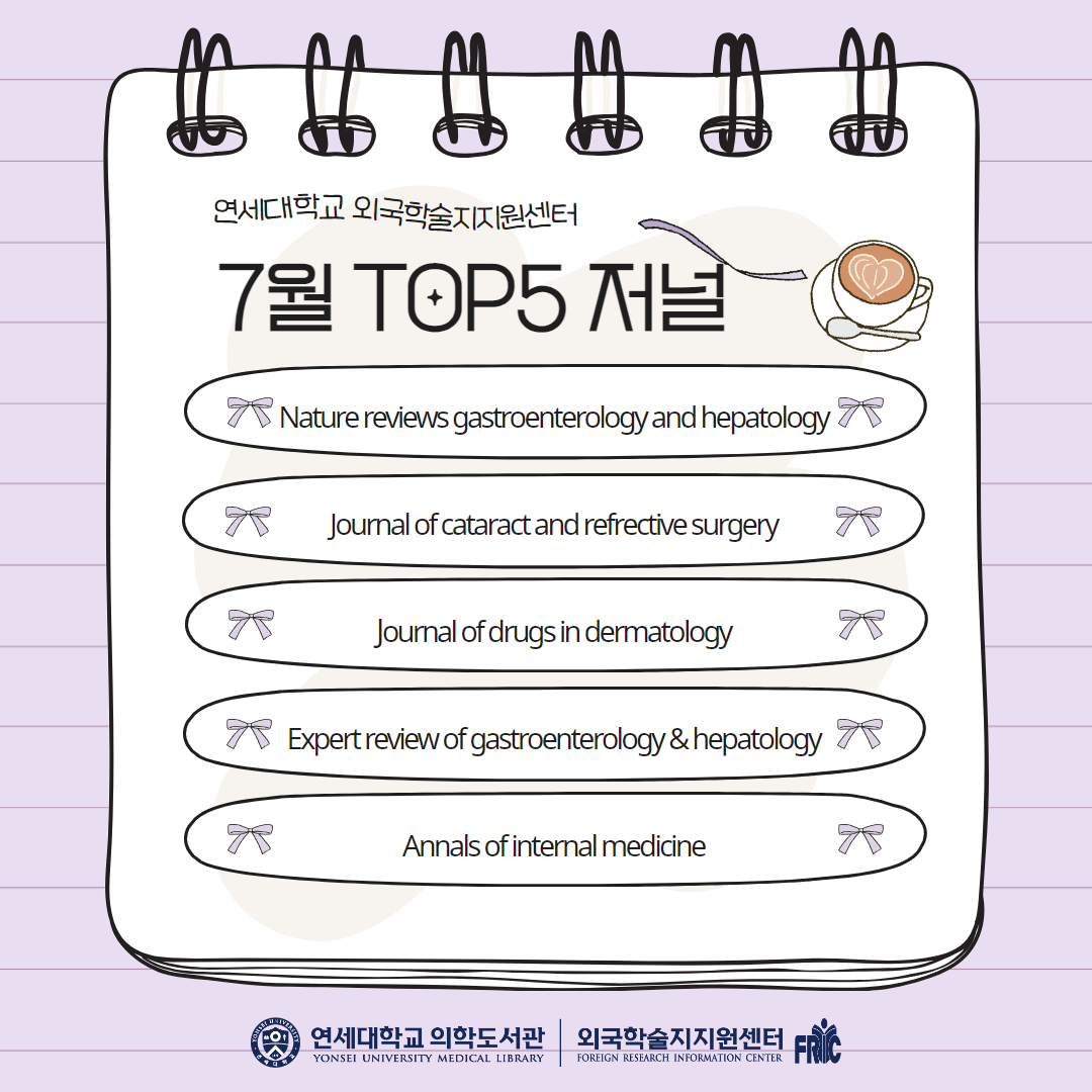 지난 7월 한 달 동안 연세대 외국학술지지원센터로 가장 많은 신청이 들어왔던 저널 5종 안내드립니다.