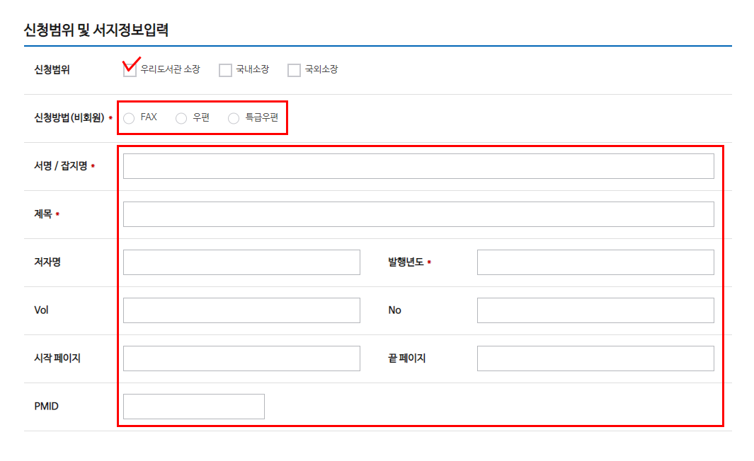 (2) 자료를 전달 받을 방법을 선택 후 서지 정보 입력 (외국학술지지원센터 소장 자료를 신청하셔야 무료입니다.)