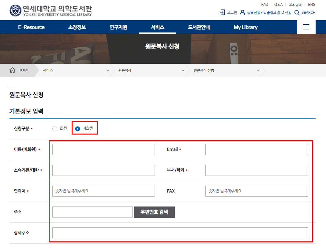 (1) 비회원 체크 후 신청자 정보 작성 (주소 : 우편 선택 시 배송 받을 주소)