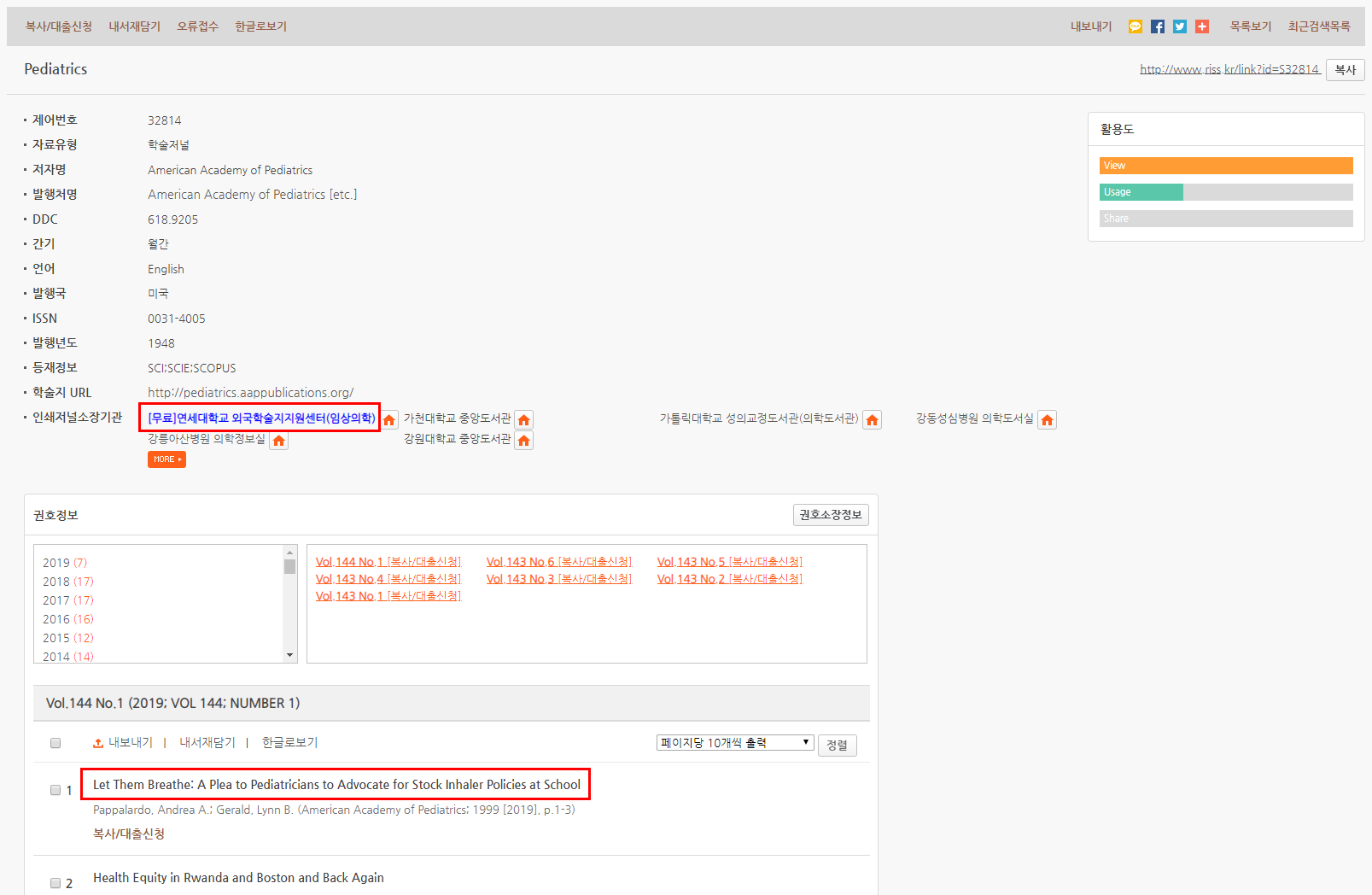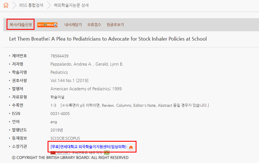 (2) 원하는 자료를 선택 후 소장처에 '연세대학교 외국학술지지원센터(임상의학)'이 있는지 확인