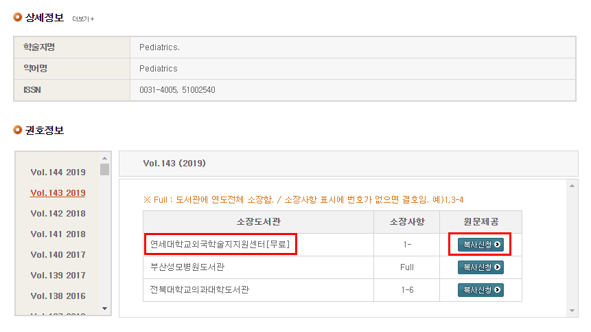 (2) 원하는 자료를 선택 후 권호정보에서 소장처에 '연세대학교외국학술지지원센터'가 있는지 확인 후 복사신청